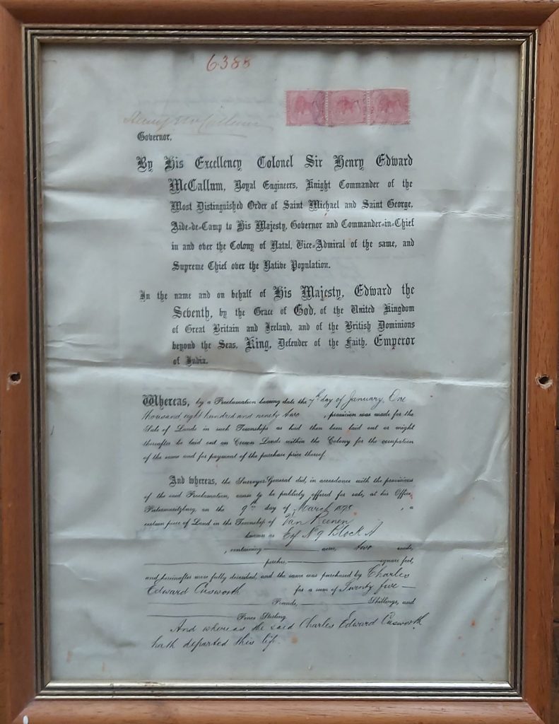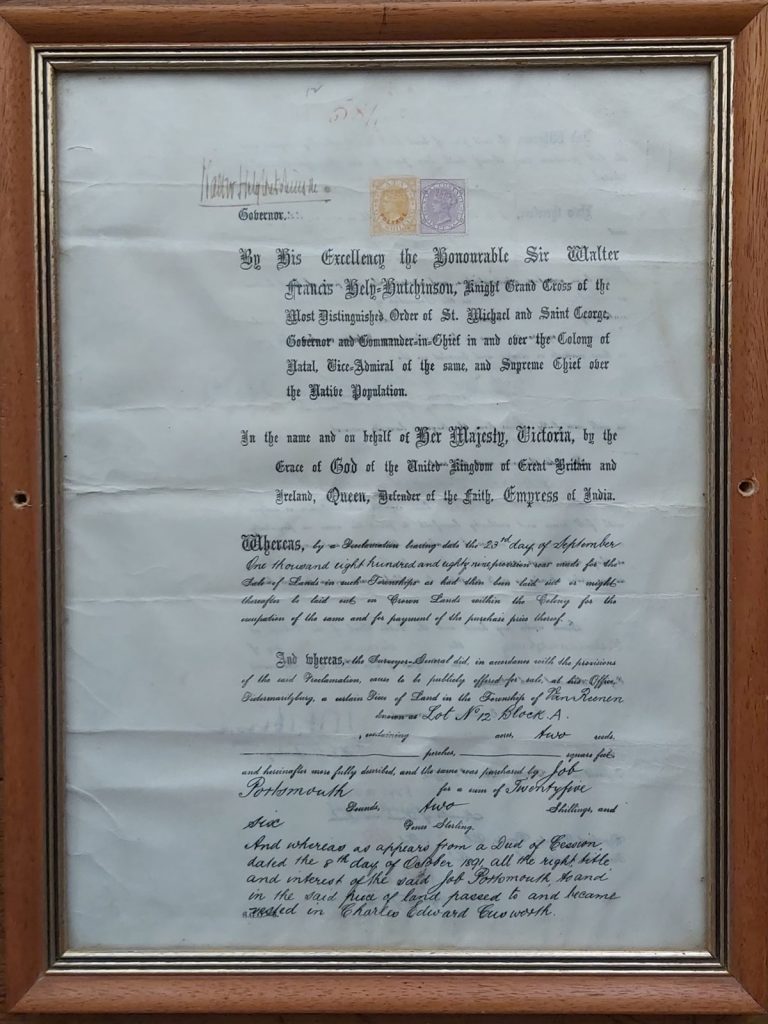 SOLD: Crown Land, on behalf of her Majesty, Queen Victoria, by His Excellency Sir Walter Francis Hely-Hutchinson, Knight Grand Cross of the Order of St. Michael and St. George, to Job Portsmouth on the 8th day of October 1891 for the sum of Twenty Five pounds, two shillings and sixpence. See the original signed deed still at the hotel today.