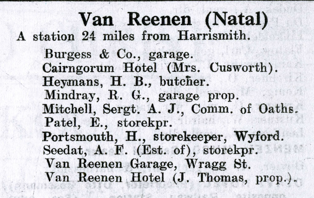 The South African Railways built houses for their employees, and even a school in the area to accommodate the sudden growth of the population in Van Reenen. A number of small trading stores were established by Indian families from the Ladysmith district. The Patel’s original shop still exists in the main street. Some of the original houses still stand in the village.